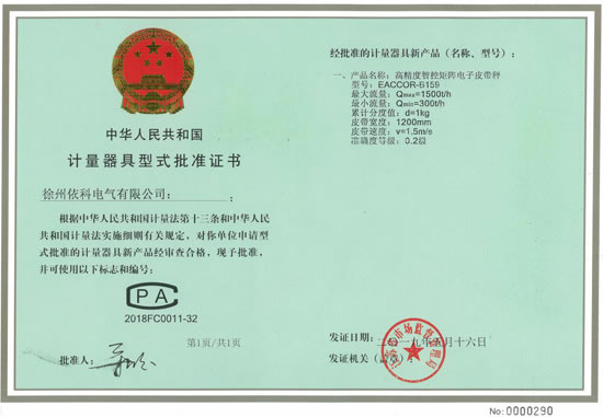 熱烈祝賀徐州依科電氣有限公司專利技術高精度智控矩陣電子皮帶秤EACCOR-B159獲得0國家0.2級計量證書CPA2018FC0011-32批準證書,配套高精度矩陣傳感器及矩陣智能稱重控制器(采用SEQ-AI智能算法,矩陣控制跟蹤復核技術,...